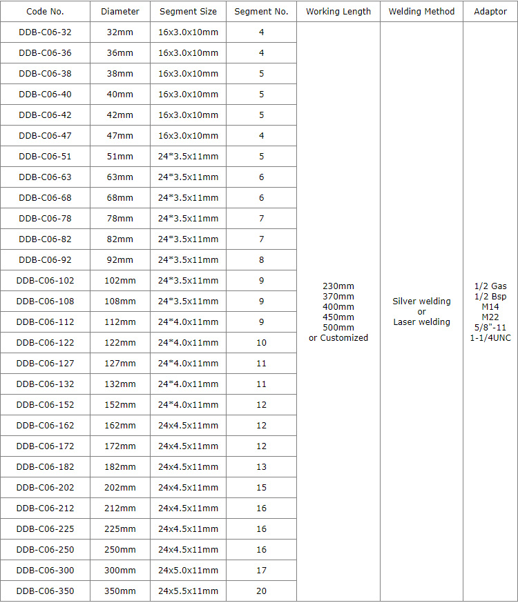 Turbo shape is benefit for segment opening, fast drilling speed, coolant and dust removal.