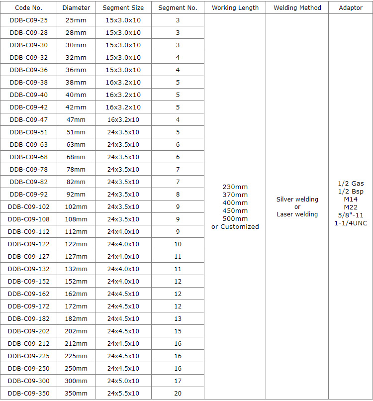 Under same bond condition, the drilling speed and life with diamond matrix segments are both minimum 20% more than other regular drill bits.