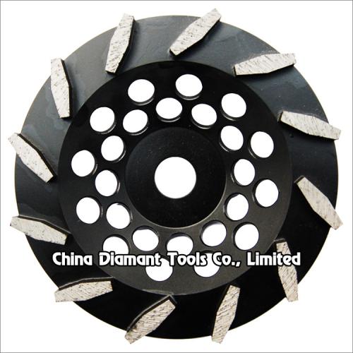 Diamond grinding cup wheels with big prismatic segments for grinding various concrete or other masonry materials such as stone, terrazzo, bricks, etc., ideal for smoothing and shaping as well as stock removal.