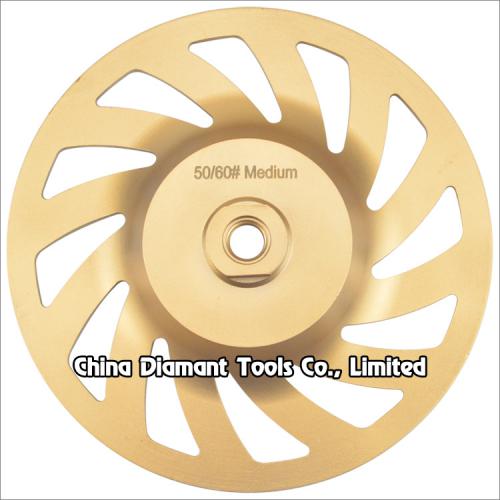 Diamond grinding cup wheels with turbo & ring rows segments for grinding various concrete or other masonry materials such as stone, terrazzo, bricks, etc., ideal for smoothing and shaping as well as stock removal.