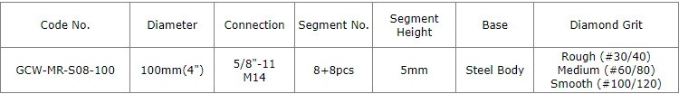 The hot-press sintered segments offers efficient and steady performance, #30 for the first step coarse grinding, #50/60 for the medium next step, #100/120 for fine grinding, Grit #100/120 diamond grits provide great finishing and much longer working life.