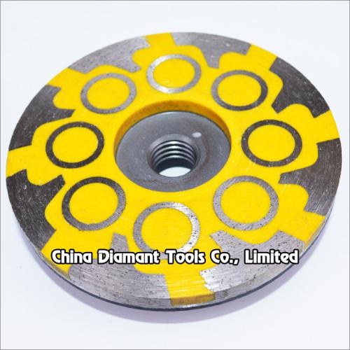 Diamond cup wheels with resin filled metal bond T & cylindrical segments for grinding various stone such as granite marble, sandstone, limestone, artificial stone, etc., ideal for smoothing and shaping as well as stock removal.