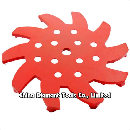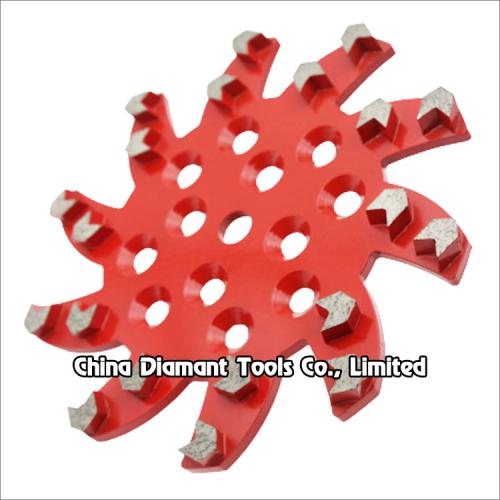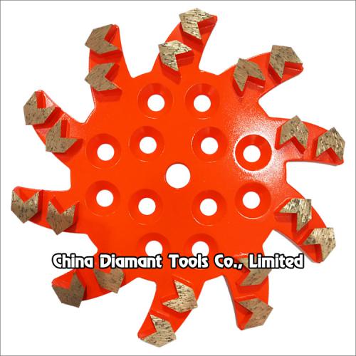 It is designed for removing hard epoxies and coatings, erasing concrete imperfections, leveling uneven spots or joints and smoothing rough or patched concrete surfaces. It has 20pcs arrow shape diamond segments and it is very high efficient for grinding deep on the concrete surface.
