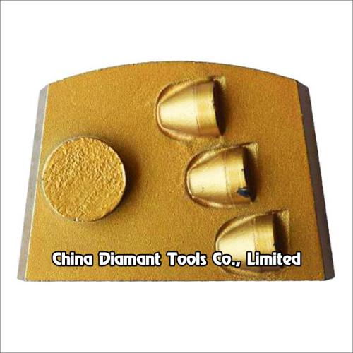 This type PCD grinding shoes floor grinding pads with 3pcs 1/2 round PCD & 1pc asisted round diamond segment are used on Lavina floor grinders for removing most types of coatings such as paint, varnish, glue, epoxy, acrylic, screed residue, VCT mastic, black tar adhesive as well as thick rubber materials on the concrete terrazzo floor.