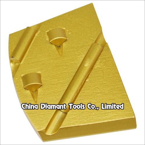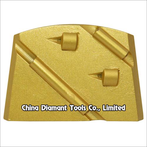 This type PCD grinding shoes floor grinding pads with 2pcs 1/4 round PCD & 2pcs assisted cylindrical TCT segments are used on Lavina grinders for removing most types of coatings such as paint, varnish, glue, epoxy, acrylic, screed residue, VCT mastic, black tar adhesive as well as thick rubber materials on the concrete terrazzo floor.