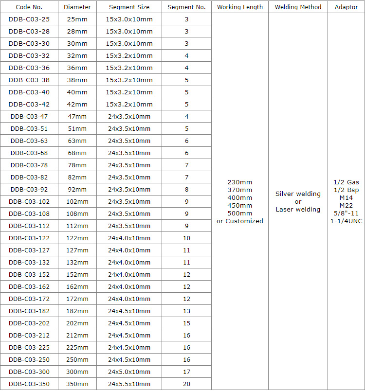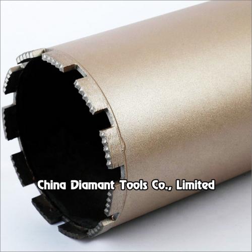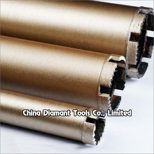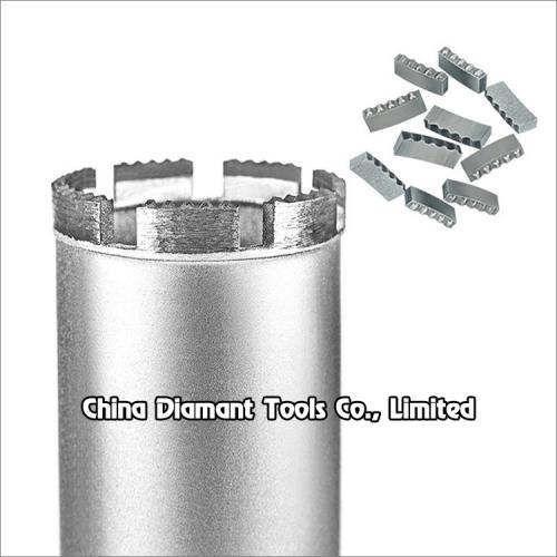 Diamond core drill bits with dot segments silver or laser welded diameter 25mm-350mm provide smooth and fast drilling for various concrete of cured reinforced concrete with hard to soft aggregates, green concrete or abrasive materials, such as construction of bridges, high-rise buildings, wall, floor, etc., which have goods quantity of drilling holes, high performance in drilling difficult operation conditions, especially reinforced concrete with much steel bars or pebble stone.