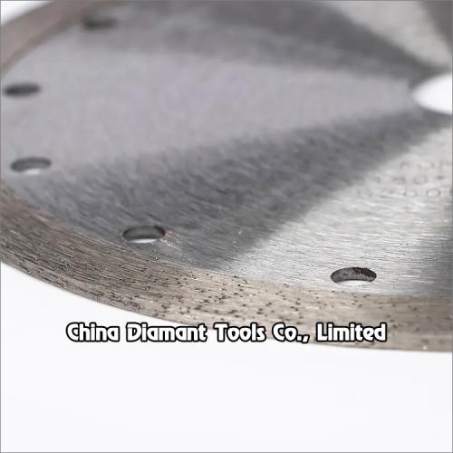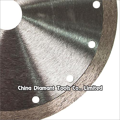 Hot press sintered diamond saw blades with continuous rim segments for fast dry cutting various hard, medium, soft stone such as granite, marble, sandstone, limestone, etc. without water or with less water.