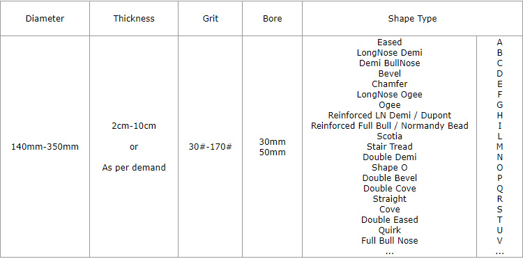 Adopting electroplating technology to deposit high quality diamond on the surface of steel core, the profile wheels have advantages of high grinding speed, no chipped edges, low noise and high working efficiency.