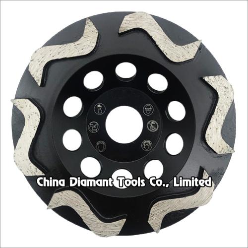 Diamond grinding cup wheels with S shape segments for grinding various concrete or other masonry materials such as stone, terrazzo, bricks, etc., ideal for smoothing and shaping as well as stock removal.
