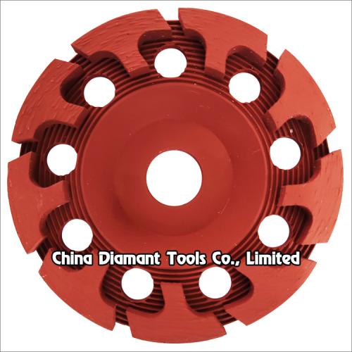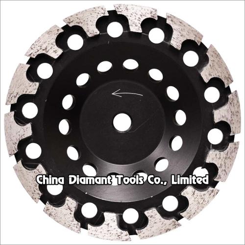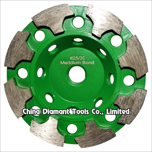 Diamond grinding cup wheels with T shape segments are brazed with a high diamond count for long life grinding various concrete or other masonry materials such as stone, terrazzo, bricks, etc., ideal for smoothing and shaping as well as stock removal, the T segments are specifically engineered to produce a clean, finished surface with fast, smooth grinding action.