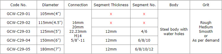 This type cup wheels with different quantity arrow segments gives a distinct advantage for speed grinding. Compared to other cup wheels with 5mm thickness segments, these 12mm height segments give too much more grinding life.