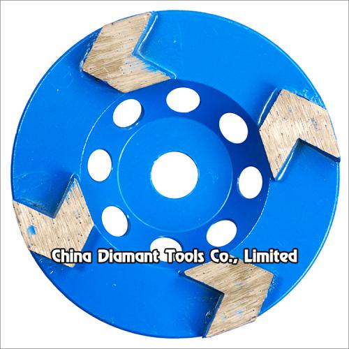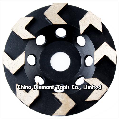 Diamond grinding cup wheels with big arrow segments are brazed with a high diamond count for long life grinding various concrete or other masonry materials such as stone, terrazzo, bricks, etc., ideal for smoothing and shaping as well as stock removal.