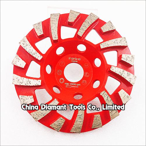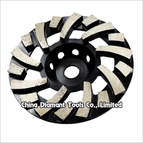 Diamond grinding cup wheels with spiral & turbo segments for grinding various concrete or other masonry materials such as stone, terrazzo, bricks, etc., ideal for smoothing and shaping as well as stock removal.