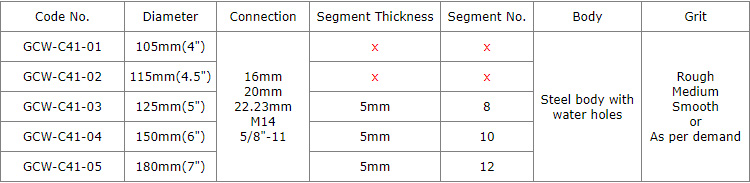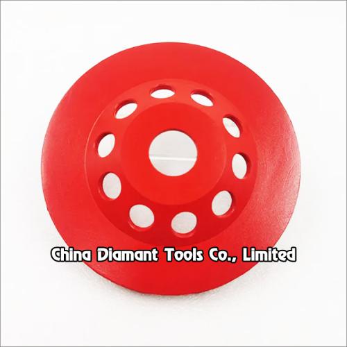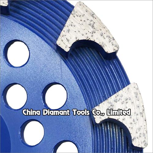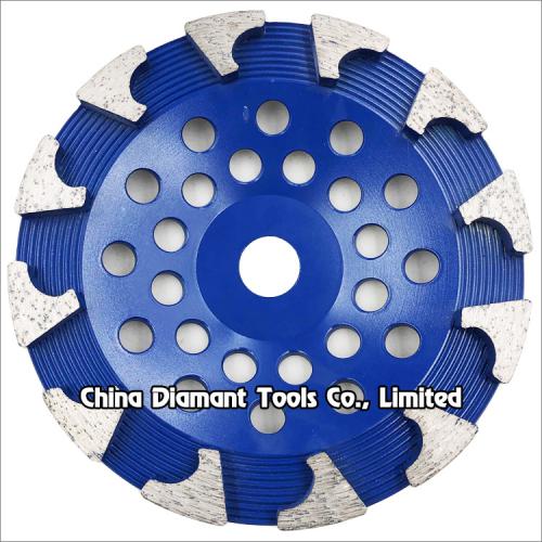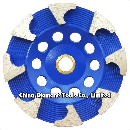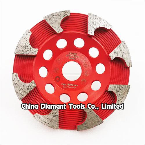 Diamond grinding cup wheels with boots shape segments are brazed with a high diamond count for long life grinding various concrete or other masonry materials such as stone, terrazzo, bricks, etc., ideal for smoothing and shaping as well as stock removal, the boots shape segments are specifically engineered to produce a clean, finished surface with fast, smooth grinding action.