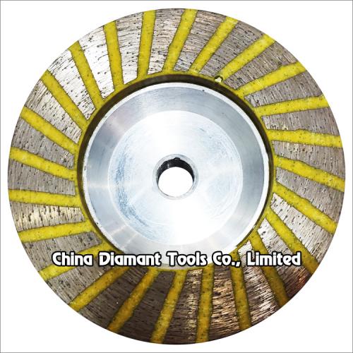 Diamond cup wheels with resin filled diagonal turbo continuous rim segments for grinding various stone such as granite marble, sandstone, limestone, artificial stone, etc., ideal for smoothing and shaping as well as stock removal.