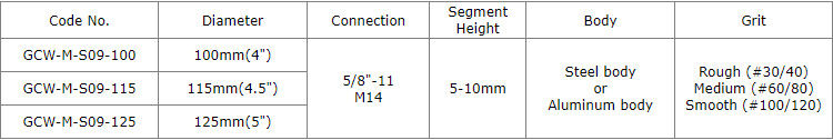 The hot-press sintered segments offers efficient and steady performance, #30 for the first step coarse grinding, #60 for the medium next step, #100/120 for fine grinding, Grit #100/120 diamond grits provide great finishing and much longer working life.