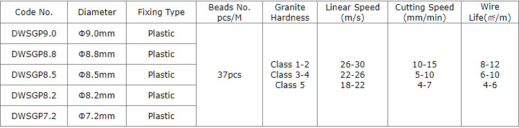 This plastic coating type diamond wire with sintered diamond beads, mostly with 7.2mm-9mm diameter which could be widely used for granite stone cutting and profiling as well at stationary in hour diamond wire saw machine at stone factory. It could be used to make stone figure sawing, edge profiling, shaping and stone cutting as well.